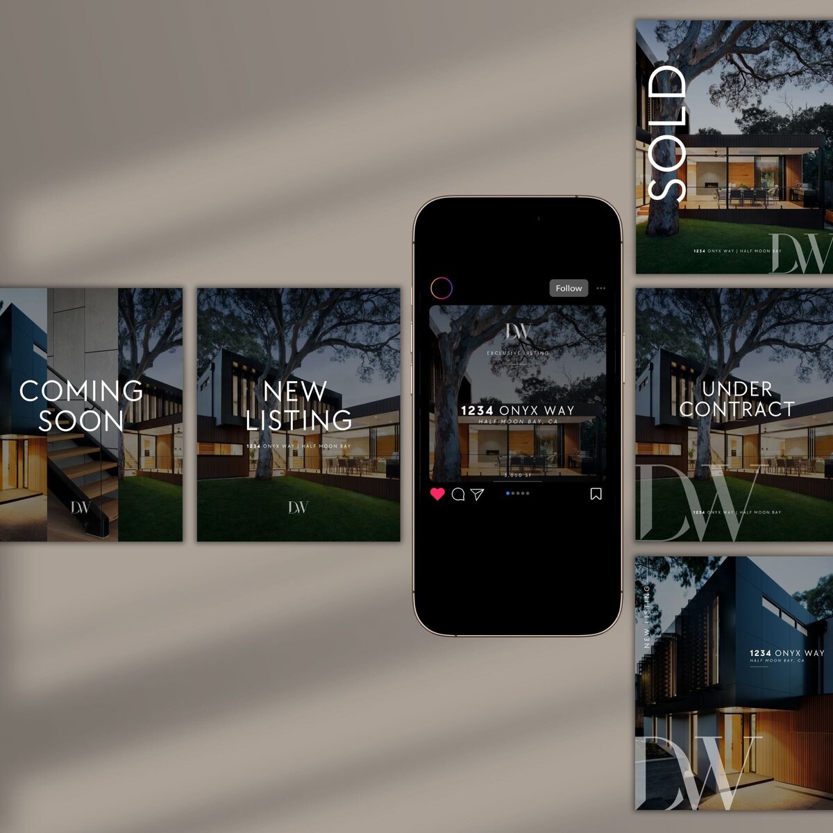 Perfect for luxury listings, boutique firms, or teams who want their brand to feel elevated and distinct, the Onyx Collection balances atmosphere with precision — proving that bold design can still feel timeless.